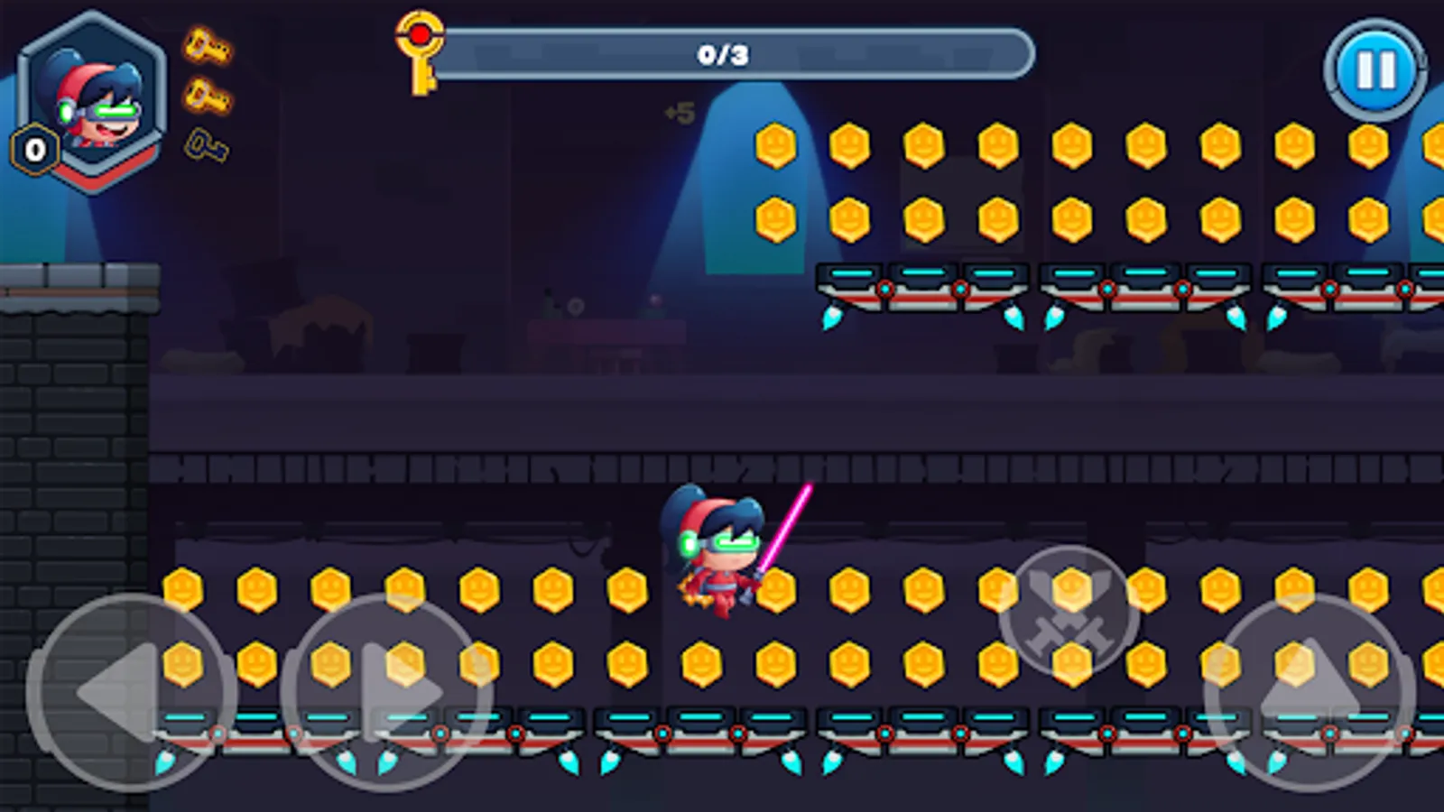 If you are fans of the 2D platformer genre will appreciate the classic mechanics and balanced physics of Swordman, object movement, traversal on moving platforms, jungle adventure, hidden tunnels, searches for secrets, star collection, and an endless jumping quest in the name of love.