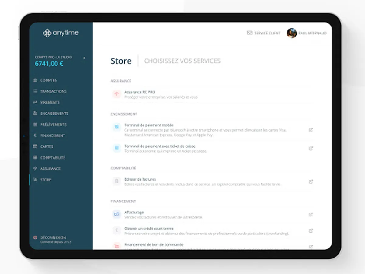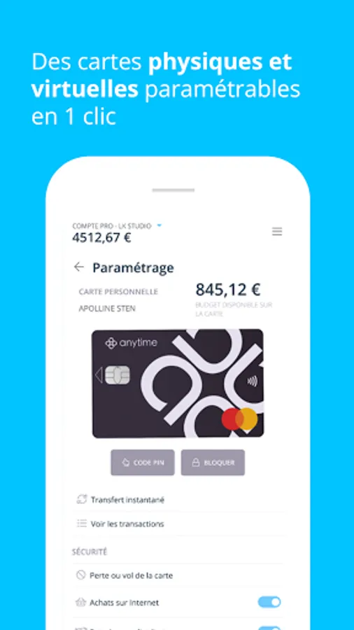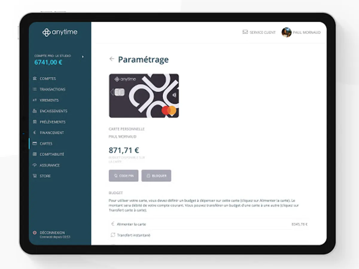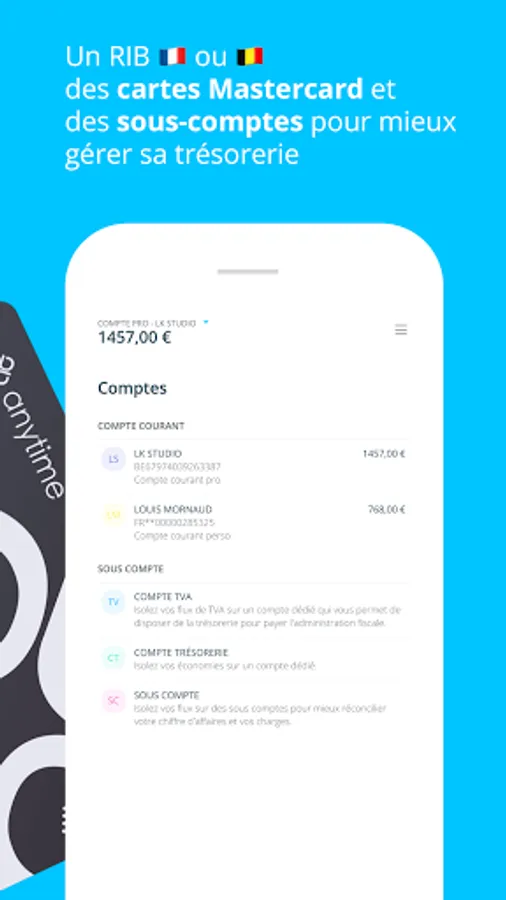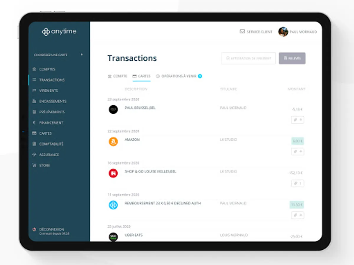 Anytime is the ideal professional account for companies, SMEs, associations and freelancers. Anytime is the alternative or complementary solution to your professional bank. Everything is simpler, digital and instantaneous.