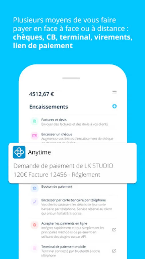 Prepare your quotes and invoices using Anytime's integrated invoicing tool. Enter customer details and manage your customer base. Whether your customers are in front of you or from a distance, we have the solutions to collect them. We offer payment links for remote collections, payment solutions for your websites or even payment terminals