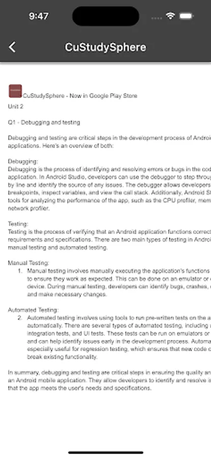 CuStudySphere is a comprehensive mobile learning app that offers students a wide range of resources to support their studies and exam preparation. The app provides personalized notes, worksheets, practice questions, and quizzes across various subjects and disciplines, tailored to the student's academic goals and progress. CuStudySphere also offers a customizable study planner, progress tracker, and study reminders, allowing students to manage their study time effectively. The app's user-friendly interface makes it easy to navigate and access study materials. CuStudySphere's innovative features, such as gamification and interactive learning modules, make learning engaging and fun. With CuStudySphere, students can enhance their academic performance, improve their exam scores, and achieve their educational goals. Keywords for the Google Play Store: CuStudySphere, learning app, study aid, personalized resources, exam preparation, academic performance, notes, worksheets, practice questions, quizzes, student, education, mathematics, language arts, progress tracking, study reminders, customizable study plans, gamification, interactive learning, exam success.