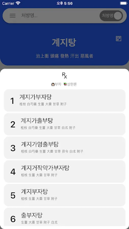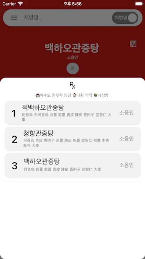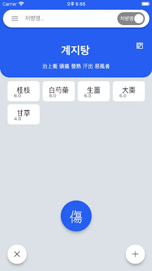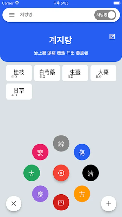 Oriental Medicine Prescription Finder. Search and analysis by herbs. Prescription studies such as Sanghan theory, Gobang, Bangyakhappyeon, Sasang medicine, and Cheongganguigam. It is a tool that easily scans prescriptions added to or subtracted from the basic prescription.
