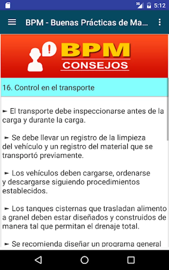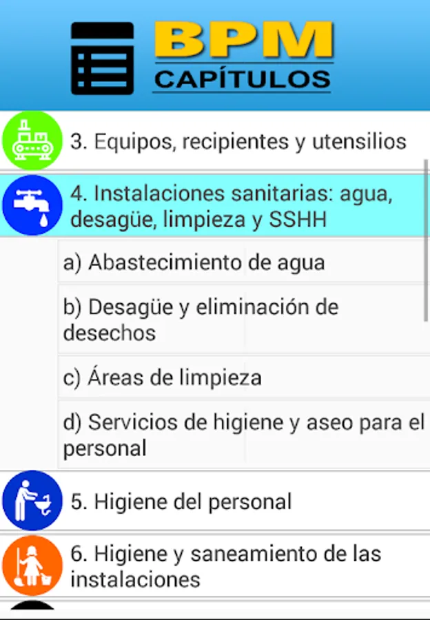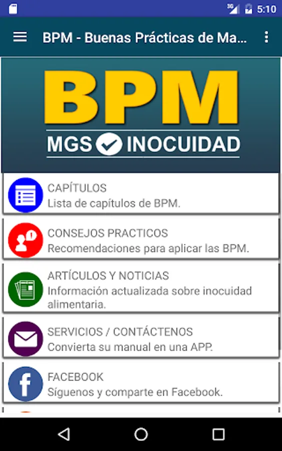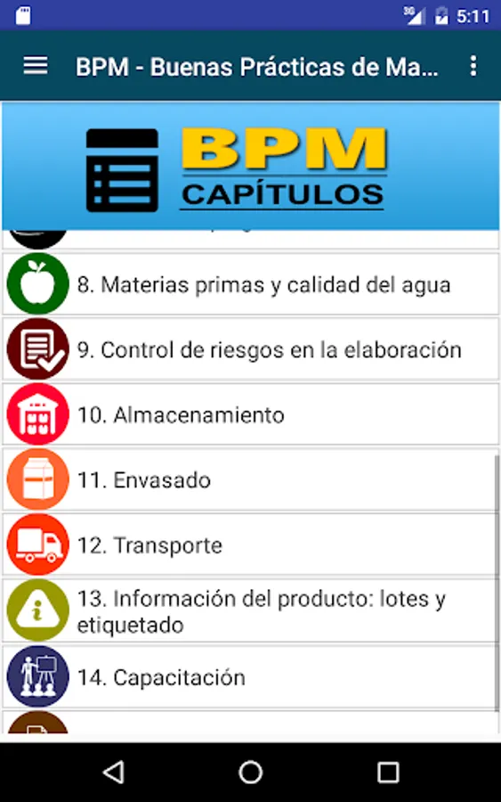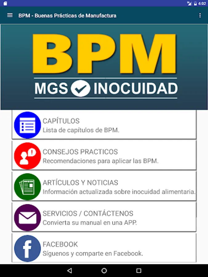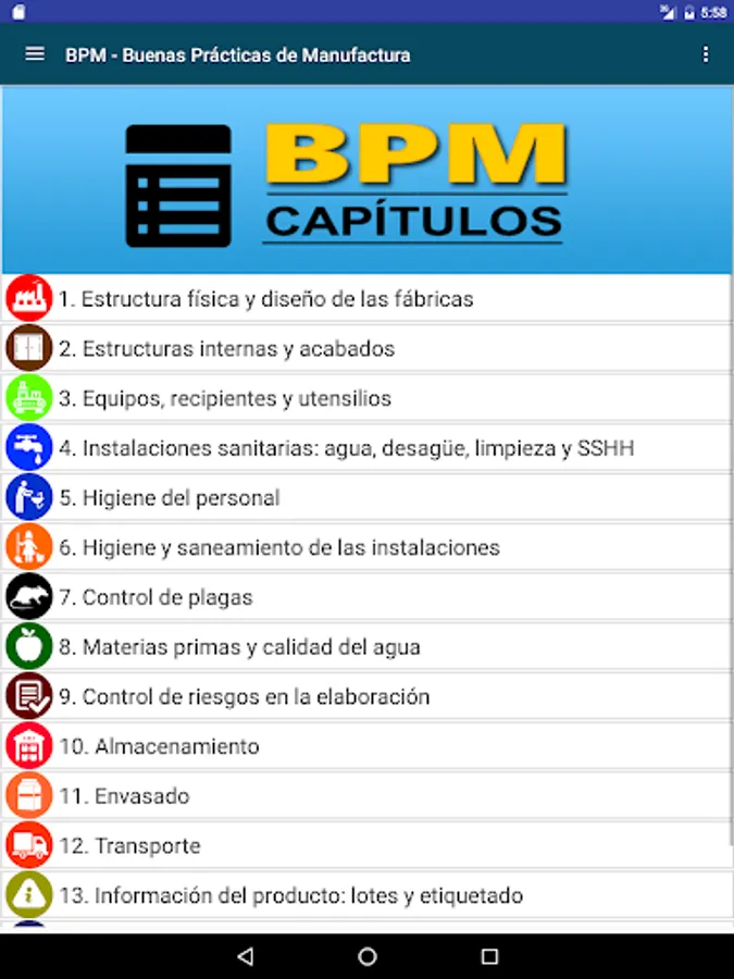 Food BPM application contains a practical guide to implementing Good Manufacturing Practices in Food; It is based on the principles and requirements of the International Code of Practice - General Principles of Food Hygiene published by the Codex Alimentarius (CAC / RCP 1-1969, Rev. 4-20031).