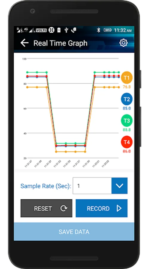 • Log temperature data and save on your smart phone or tablet at interval from 1 to 60 seconds