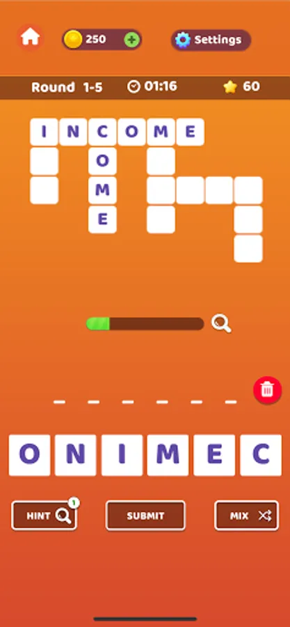 ★ Given scrambled 6 letters you should unscramble the hidden 6 words connected to each other like a crossword.