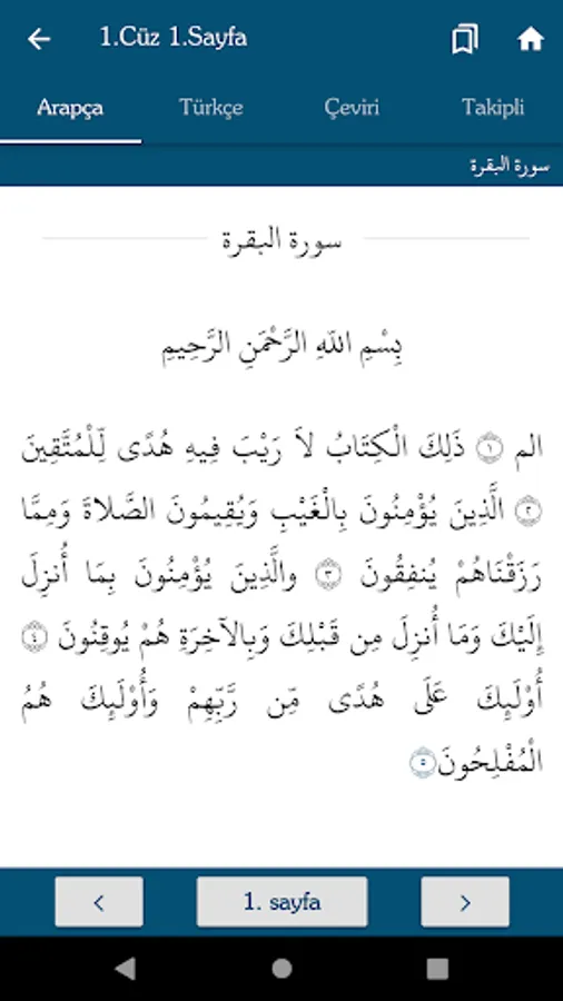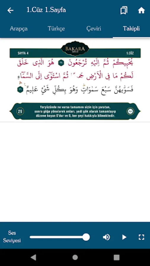 You will be able to read the Quran in Arabic and Turkish by listing the chapters and parts of the Quran. You will be able to view the translation of the page you are reading.