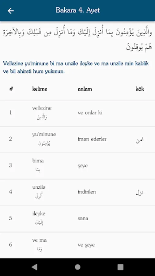 If you want, you will be able to read verse-based Arabic, Turkish and translation by verse by verse. You will be able to access the word, meaning and root information of each verse.