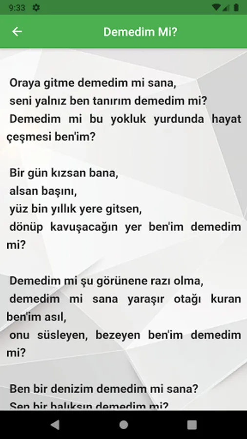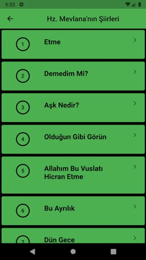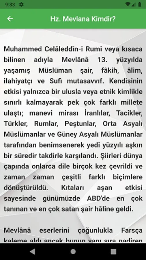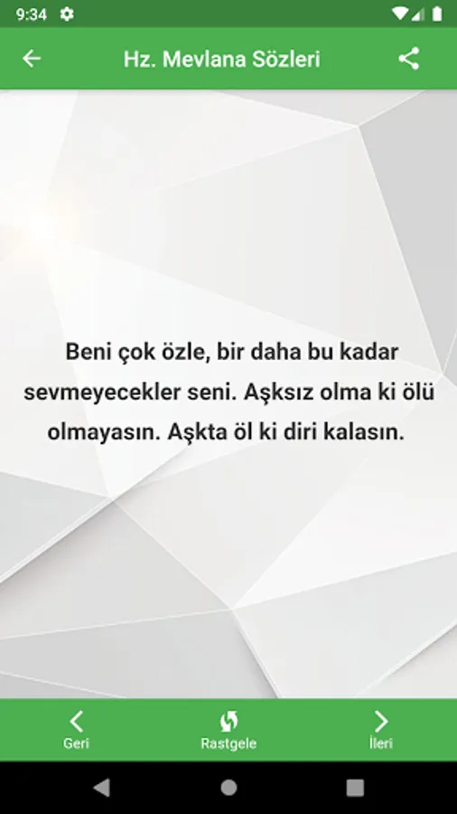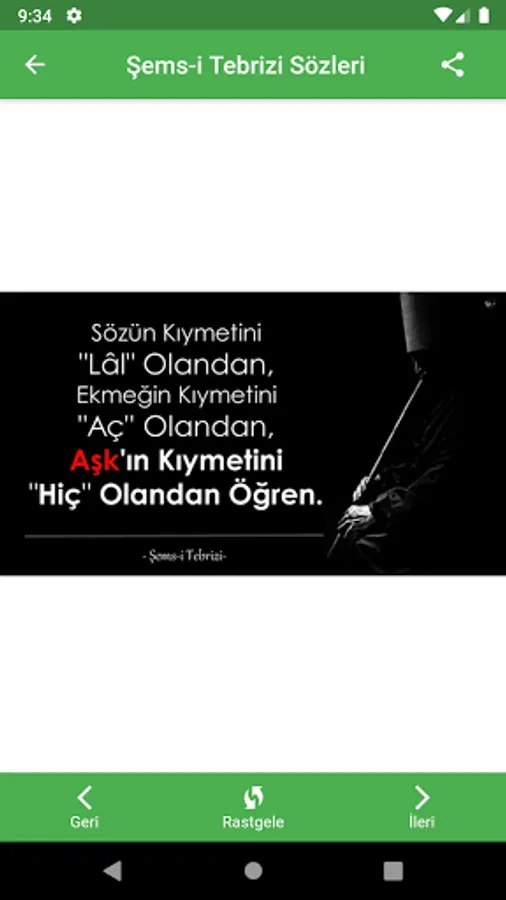 Our 2021 Mevlana application is on the air. Who is Mevlana? Who is Shams-i Tabrizi? You can reach Mevlana's biography, works, poems, advice, stories from masnavi, and the biography of Şems-i Tebrisi for free. With our application, you can share the words of Mevlana with pictures or in writing, the words of Şebs-i Tebrizi with pictures or in writing, or via social media sharing programs such as Facebook, Twitter, Whatsapp.