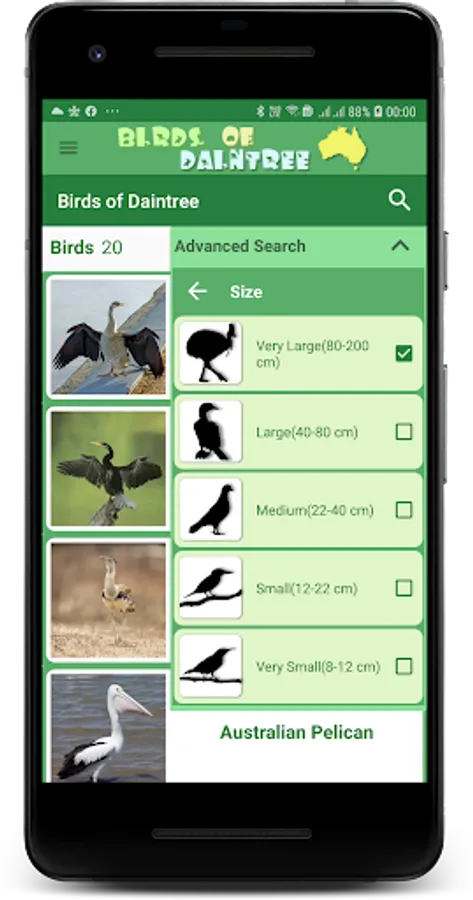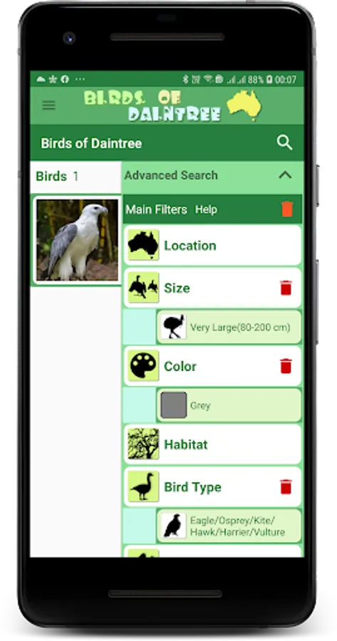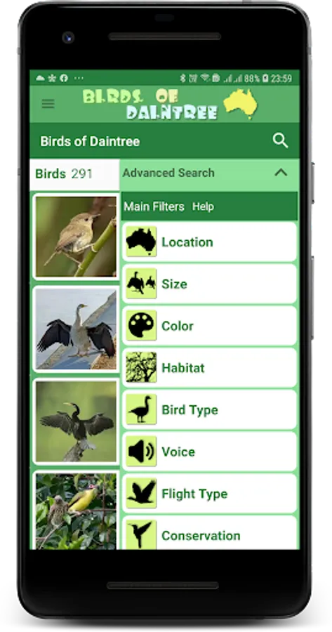 Australia Birds ID Daintree app acts as a smart field guide to identify birds in Daintree national park(Queensland Australia). The search engine contains 291 species of birds in Daintree national park and provides filters to search for any specific bird. Filters available in the app are as follows -