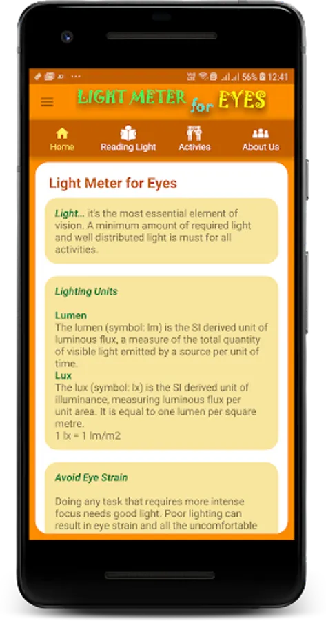 Vision symptoms can include eye fatigue, eye strain, irritation, itching or burning, blurry vision, and dry eyes or tearing. Use Light Meter for Eyes App to measure light while performing any task to make sure you don't strain your eyes. It provides real time measure of visible light and suggests if the light is good enough for the activity being performed