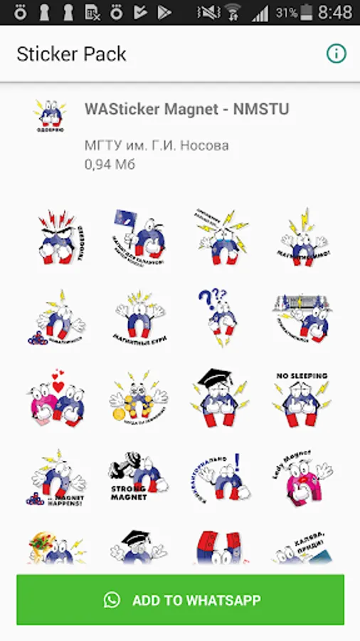 The emotional Magnit Magnitich is very worried about your every session, every lack of sleep and every day spent at the university))) Therefore, he will express your emotions for you! Install a complete set of stickers and chat with friends on WhatsApp!