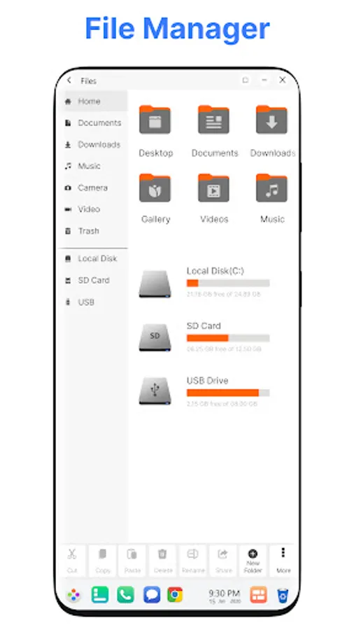 - Listing of all of your drives, SD Card, Storage, audio and video files and pictures in PC style.