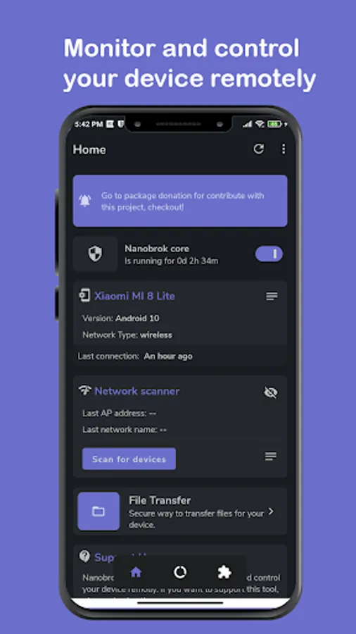 Nanobrok is a security mobile tool that provides a secure communication with your remote server to control your device for every you want.