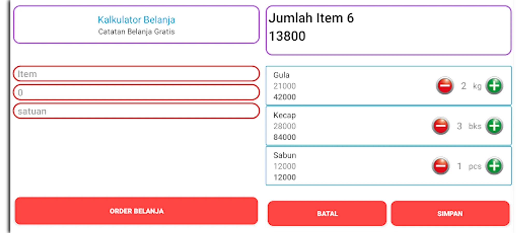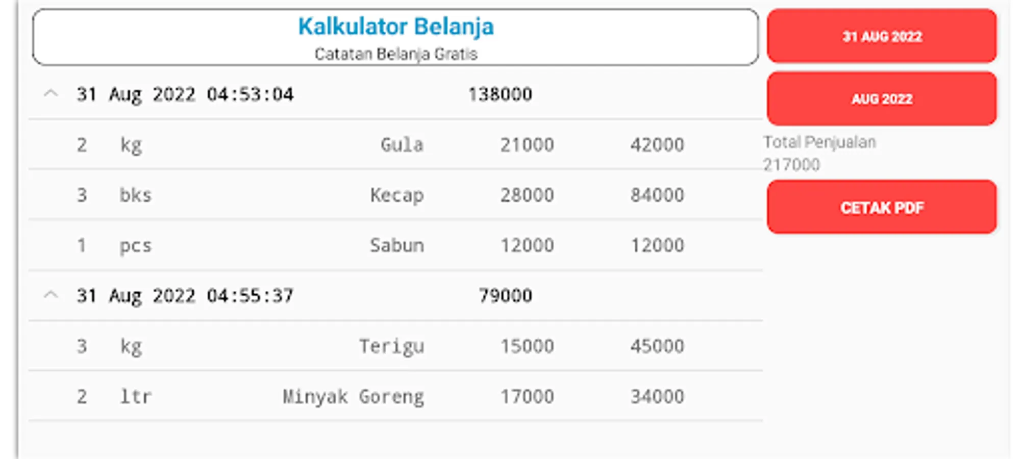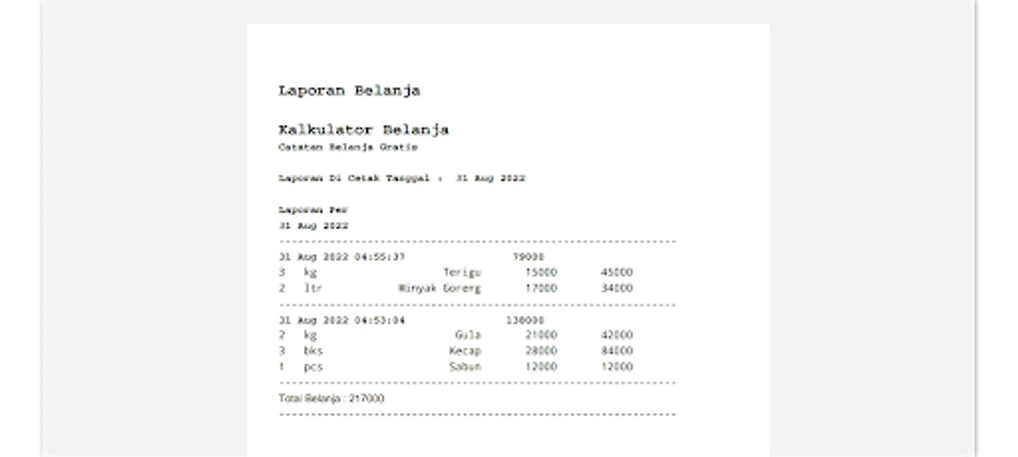 Shopping records, both the name of the item, the amount, the price and the total shopping are sometimes needed to find out how much the total spending in a day or month can be seen in the Shopping Calculator