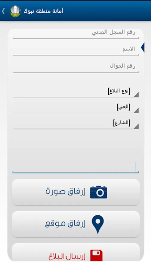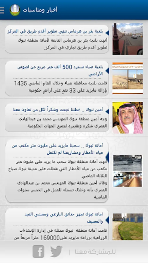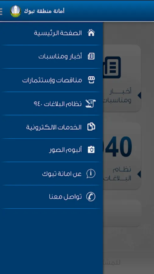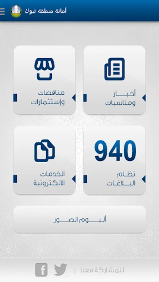 Tabuk Municipality has always sought to develop means of emergency communications to serve the citizens and therefore has been developed 940 communications system on the application of smart phones so that the amount of the registration author proud and attach a copy of the offense and also locate the author on the map and then can follow the author through electronic inquiries. For the sake of the secretariat of the Tabuk region on the media side to educate citizens were smart phone to view the Secretariat News and Tabuk area development, was also taking into account the width of all investments and Tenders honestly Tabuk region.
