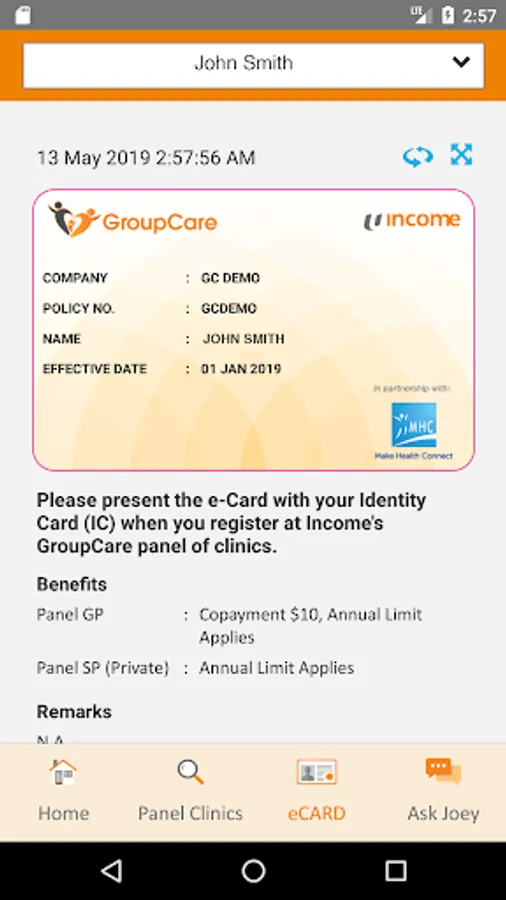 Exclusive to our members only. Forgotten your card on your visit to the clinic? You can now retrieve your eCard instantly. Access rights must be enabled by HR Manager first.