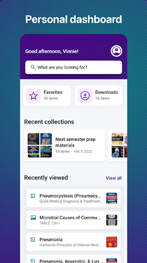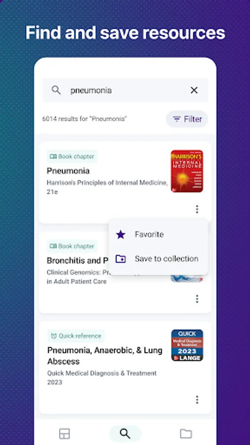 • Find and save resources - search anything from symptoms to procedures and then favorite, or save to a collection.