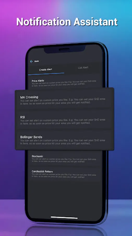 With notif assist you are not long late in making market transactions, here you can get notifications in certain conditions, for example MA crossing, Price Alert, RSI, bollinger bands, stochastic and more.