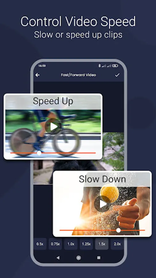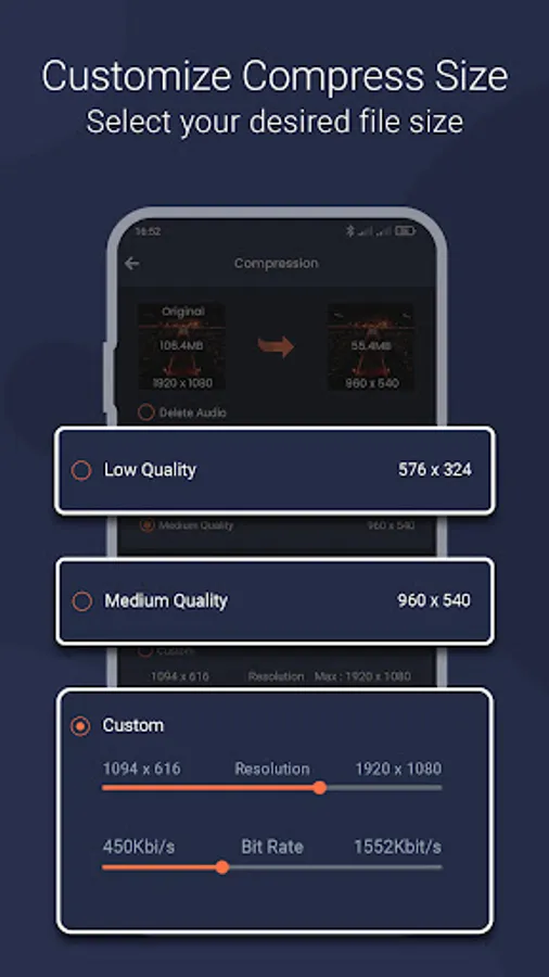 You can first see the preview of your file size and only then save it back to your device. Desired video size is an approximation value, the file size of the output video will be close to this value, it cannot be greater than the source file size.