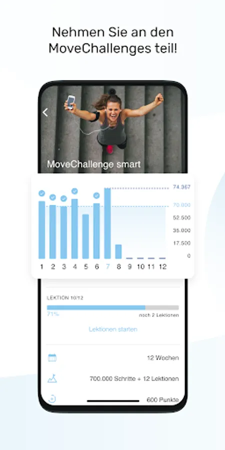 Motivating challenges: We challenge you to achieve a specific goal within a period of time that you can determine yourself. If you master the MoveChallenges, up to € 50 or 500 Fitcash points are waiting for you as a bonus at mhplus. In addition, there are always sporting bonuses waiting for you!