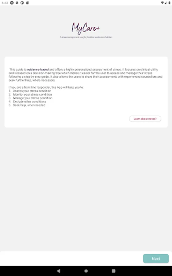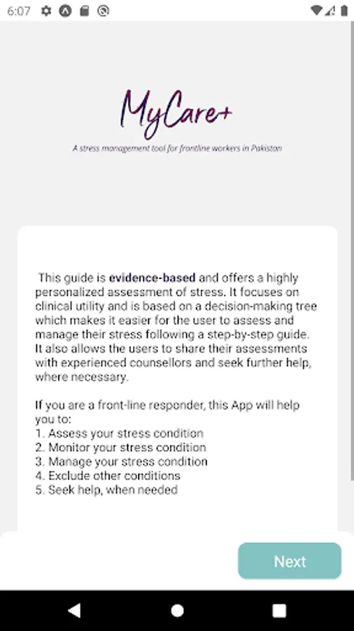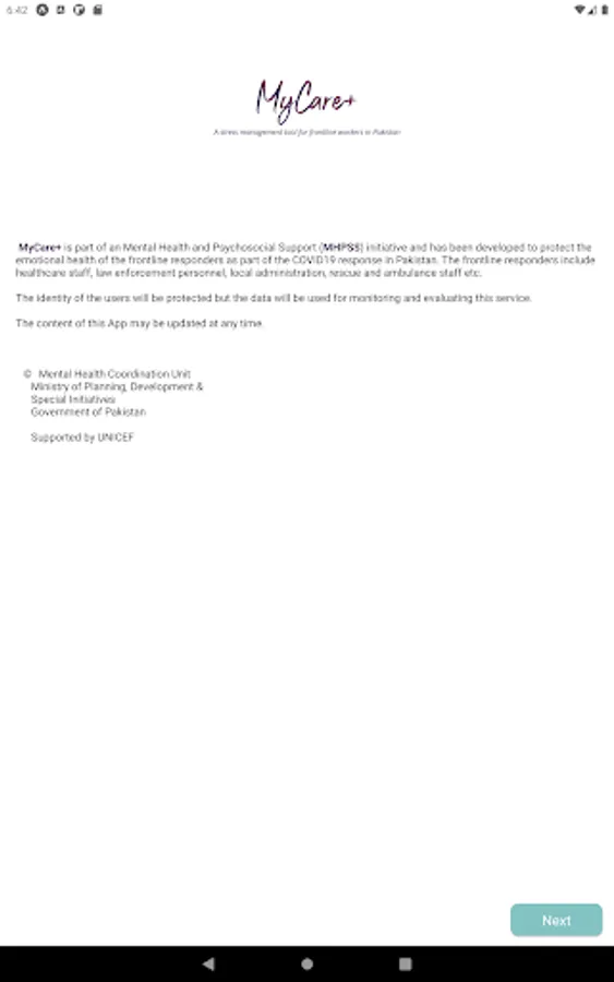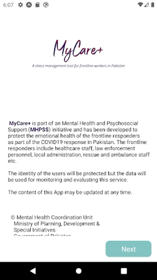 MyCare+ is part of a Mental Health and Psychosocial Support (MHPSS) initiative and has been developed to protect the emotional health of the frontline responders in Pakistan. The frontline responders include healthcare staff, law enforcement personnel, local administration, rescue and ambulance staff etc.