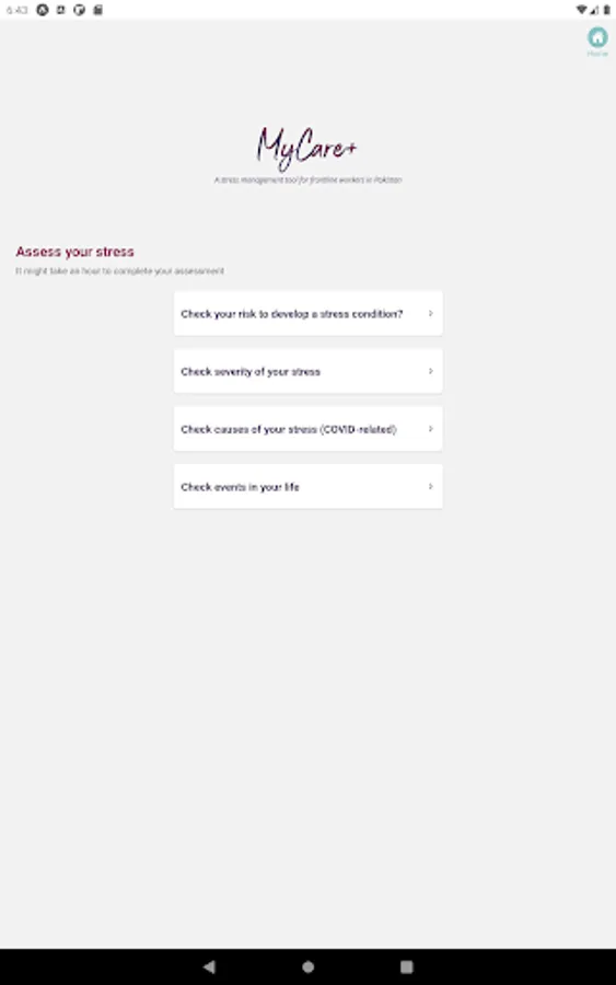 This guide is evidence-based and offers a highly personalized assessment of stress. It focuses on clinical utility and is based on a decision-making tree which makes it easier for the user to assess and manage their stress following a step-by-step guide. It also allows the users to share their assessments with experienced counsellors and seek further help, where necessary.