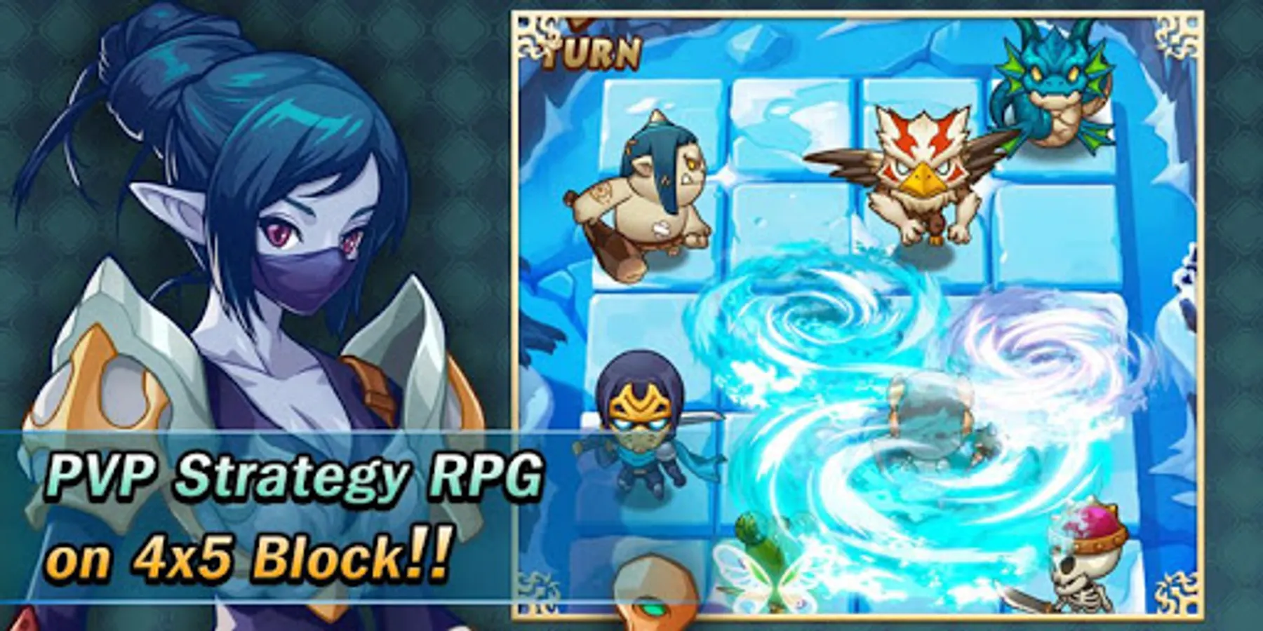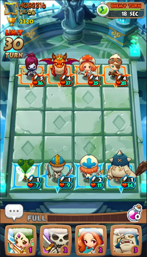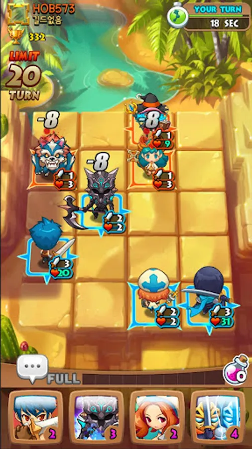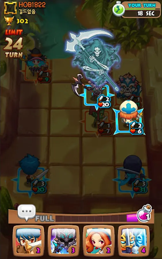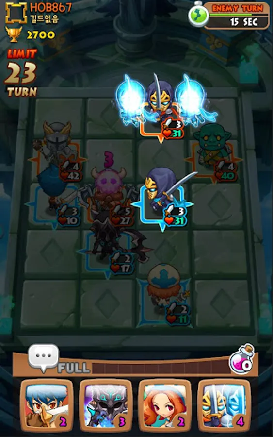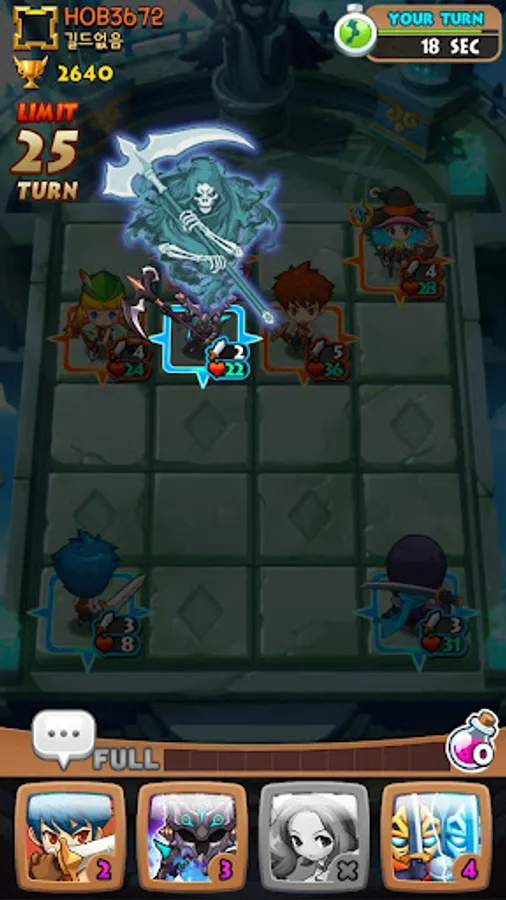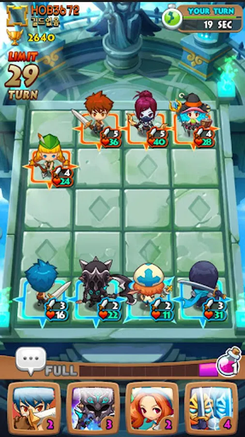 Different RPG heroes including Warrior, Wizard, Archer, Healers fac each other with thousands of different strategies on 4x5 block.
