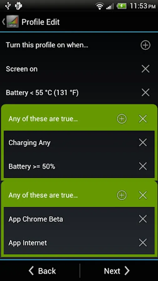 Automate SetCPU with profiles! SetCPU allows you to set up powerful profiles to change your settings under certain conditions, such as what app is running, when the phone is asleep or charging, when the battery level drops below a certain point, when the phone's temperature is too high, or during certain times of day. See the screenshots for examples of how you might set up profiles.