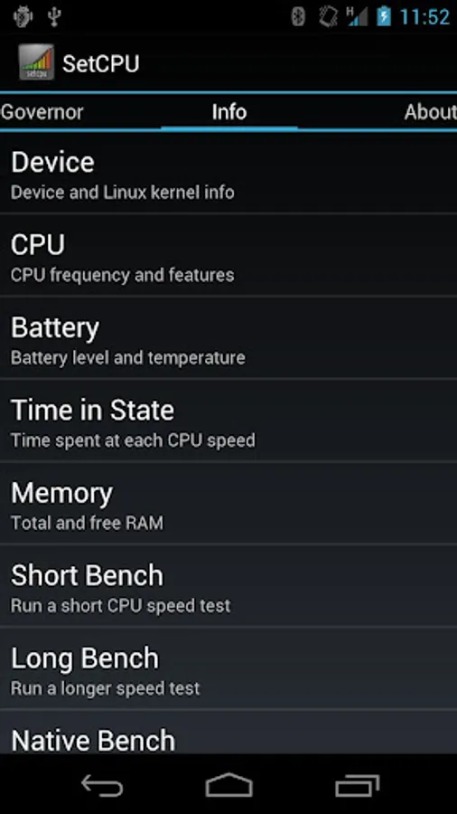 SetCPU is a tool for changing the CPU settings on a rooted Android phone or tablet. SetCPU works with a great variety of Android devices and ROMs, including the HTC One series, Samsung Galaxy series, and Nexus devices. You're under control: SetCPU can improve your performance, save battery, or both!