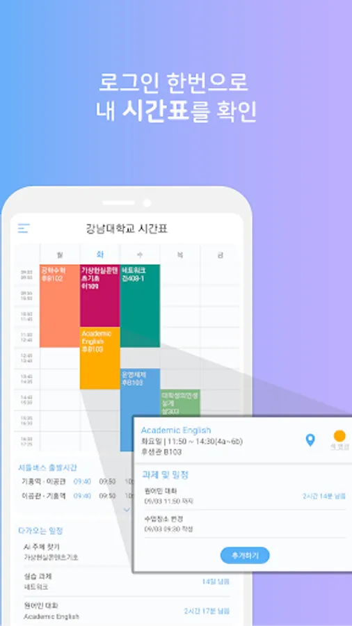 강남대 시간표 앱과 함께 더욱 더 재밌고 알찬 대학생활을 즐기세요.