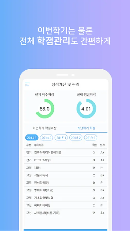 - 학점계산 : 이번학기에 듣는 과목들을 갖고 미리 학점 계산을 간편하게 할 수 있게 제공합니다.