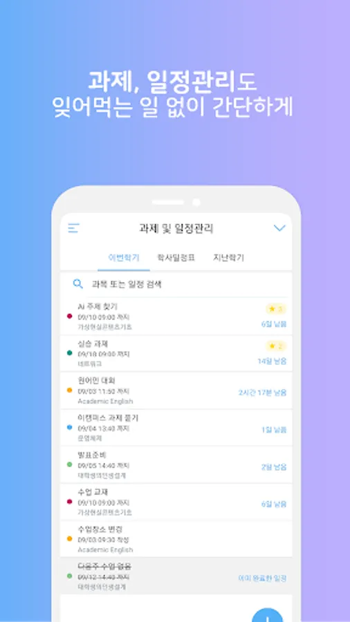 - 과제 및 일정 관리 : 내가 수강하는 과목의 각종 과제나 모든 일정을 간단한 메모를 통해 등록할 수 있으며, 마감시간이 다가오면 알람도 함께 울립니다. 이제 과제 등의 모든 일정을 까먹는 일 없이 관리하세요.