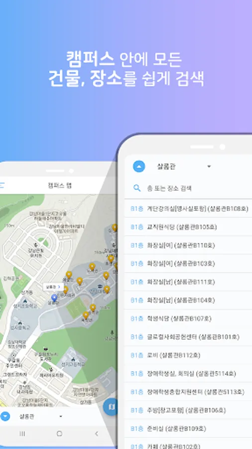 - 각 건물내 장소 검색 : 학교내 위치한 모든 건물에 장소를 쉽게 검색해서 찾아보세요.(교수님의 연구실, 강의실, 실습실, 식당, 문구점은 물론 화장실 각종 창고까지 모두 검색 가능합니다.)