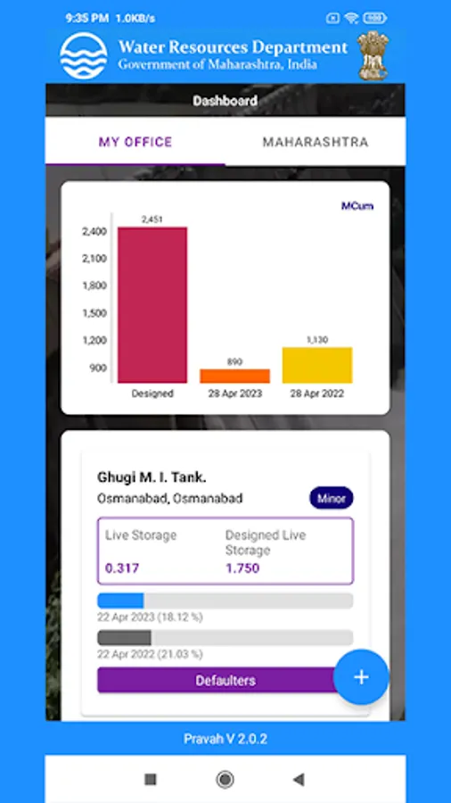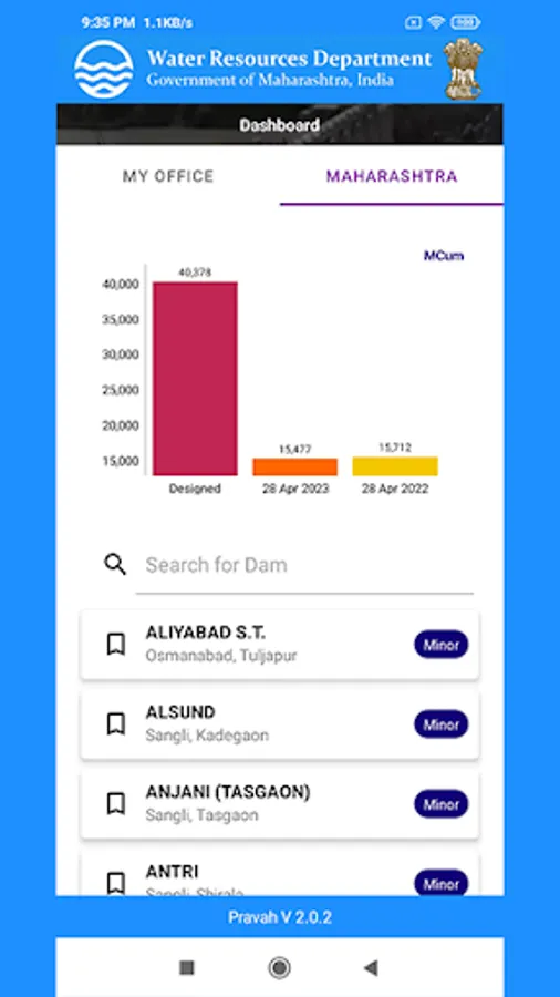 MWRD Pravah application is provided by Water Resource Department (MWRD) of Maharashtra to its citizens under Right to Information (RTI). It also enables MWRD employees to check and update water storage level in different water reservoirs, tanks and dams.