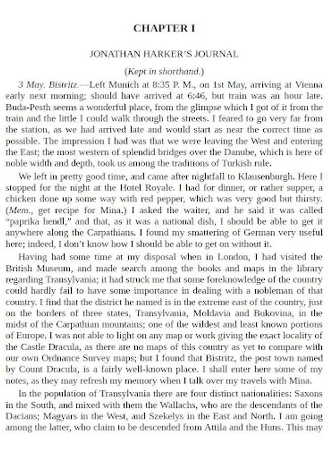 Count Dracula had directed me to go to the Golden Krone Hotel, which I found, to my great delight, to be thoroughly old-fashioned, for of course I wanted to see all I could of the ways of the country. I was evidently expected, for when I got near the door I faced a cheery-looking elderly woman in the usual peasant dress—white undergarment with long double apron, front, and back, of coloured stuff fitting almost too tight for modesty. When I came close she bowed and said, “The Herr Englishman?” “Yes,” I said, “Jonathan Harker.” She smiled, and gave some message to an elderly man in white shirt-sleeves, who had followed her to the door. He went, but immediately returned with a letter:—