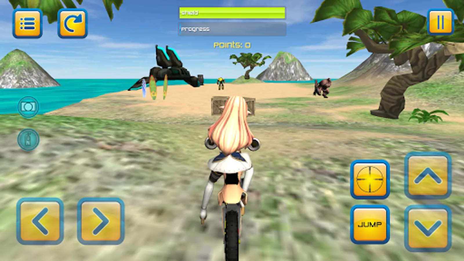 There was a robots and evil monsters invasion. Your mission is to ride your motorbike, defeat all enemies and perform all stunts on your way to victory. Control powerful anime style girl on a motocross bike, use super sci fi weapon and complete all challenging futuristic levels!