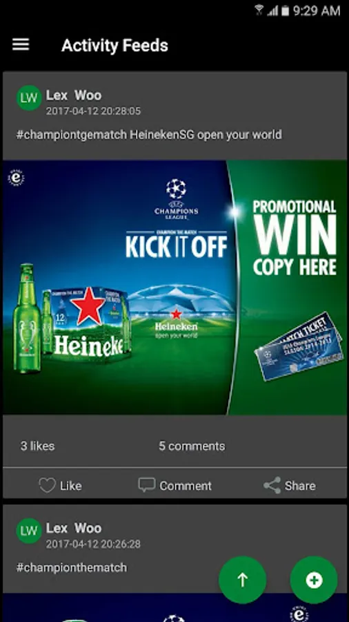 The official Heineken #ChampionTheMatch mobile application for the Heineken® UEFA Champions League campaign season 2017 . The continuation of the #ChampionTheMatch campaign from online games to the actual day event , this encourages and enables an extraordinary match-viewing experience together with true fans of UEFA Champions League. This year, we’re bringing our game to the next level by delighting the chosen fans of UEFA Champions League to a legendary night full of fun and camaraderie spirit. The HeinekenSG Mobile App allows this experience to be fulfilled with features such as group chats, programme of the night and activities engagement.
