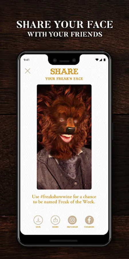 Download the app Freakshow Maskerade app to transform into vintage-inspired circus freaks and take a selfie–photo or video–to share with your friends and followers on Instagram, Facebook, SnapChat, WhatsApp, and more. Share with the hashtag #freakshowwine to be featured as our Freak of the Week!