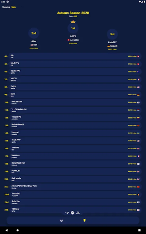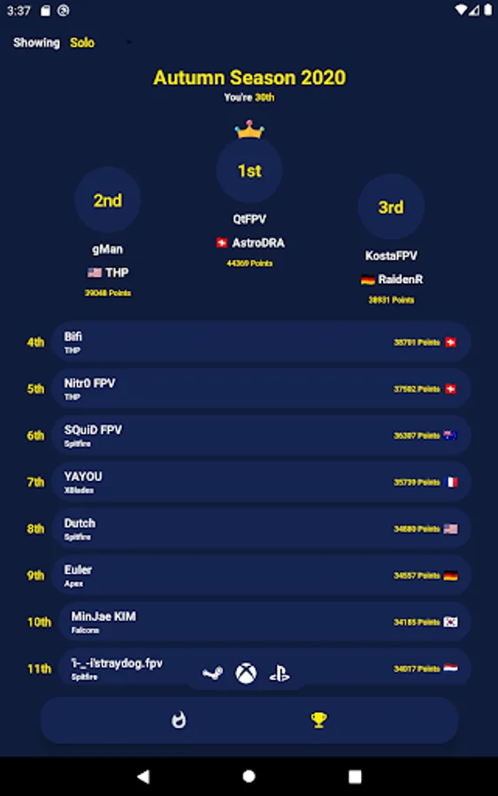 When opening the app, you'll see instantly where your tracked pilot (most likely yourself) is ranked. In the Leaderboards tab it's possible to filter for different platforms with the tap of a button