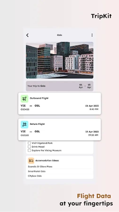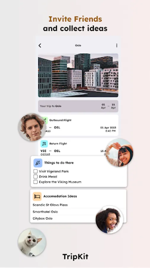 Start by brainstorming your upcoming trips, add flight data and invite your friends to join in on the planning process. With the ability to add things to do on the trip and accommodation ideas, TripKit makes it easy to create a complete itinerary for your next adventure.