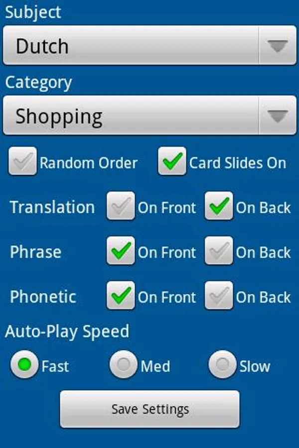 Choose to display the English Translation, the Phrase and the Phonetic Text on the front or the back of the card in any combination.