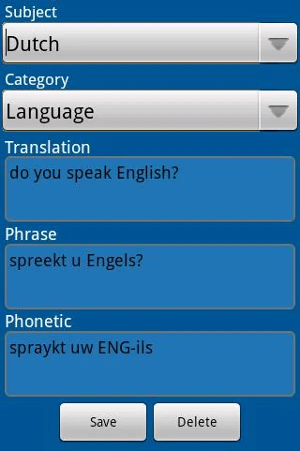 Flash Dutch was designed to be simple and efficient and fulfill its single purpose well. It does not include any audio phrases, nor does it keep score of any test runs. There are other applications that provide that capability, though, they cost a lot more.