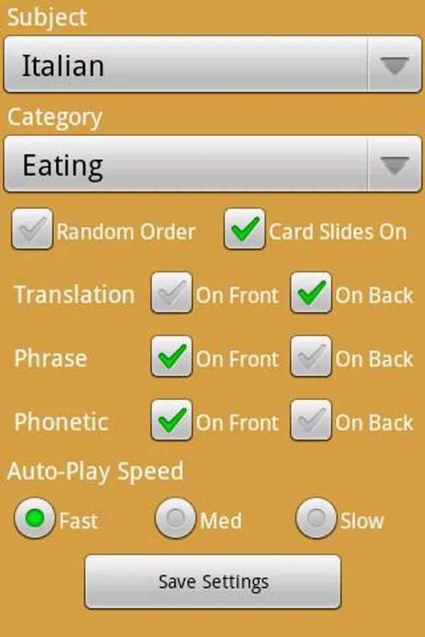 Choose to display the English Translation, the Phrase and the Phonetic Text on the front or the back of the card in any combination.
