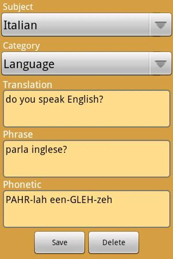 Flash Italian was designed to be simple and efficient and fulfill its single purpose well. It does not include any audio phrases, nor does it keep score of any test runs. There are other applications that provide that capability, though, they cost a lot more.