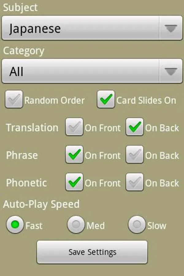 Choose to display the English Translation, the Phrase and the Phonetic Text on the front or the back of the card in any combination.