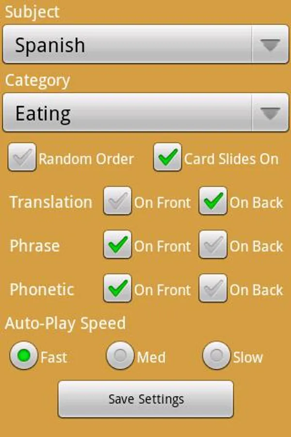 Choose to display the English Translation, the Phrase and the Phonetic Text on the front or the back of the card in any combination.