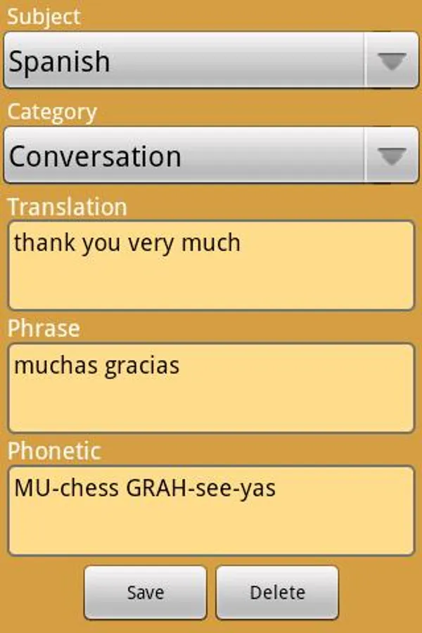 Flash Spanish was designed to be simple and efficient and fulfill its single purpose well. It does not include any audio phrases, nor does it keep score of any test runs. There are other applications that provide that capability, though, they cost a lot more.