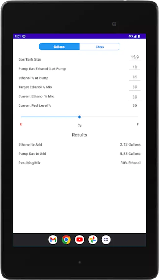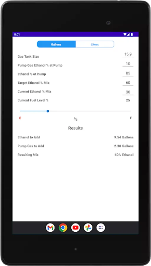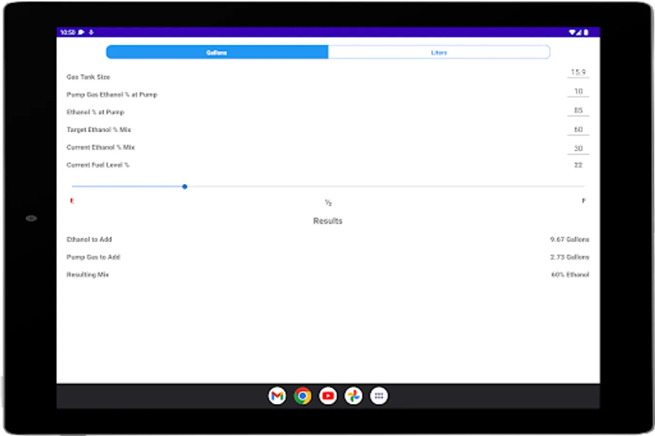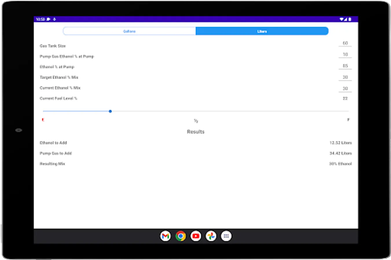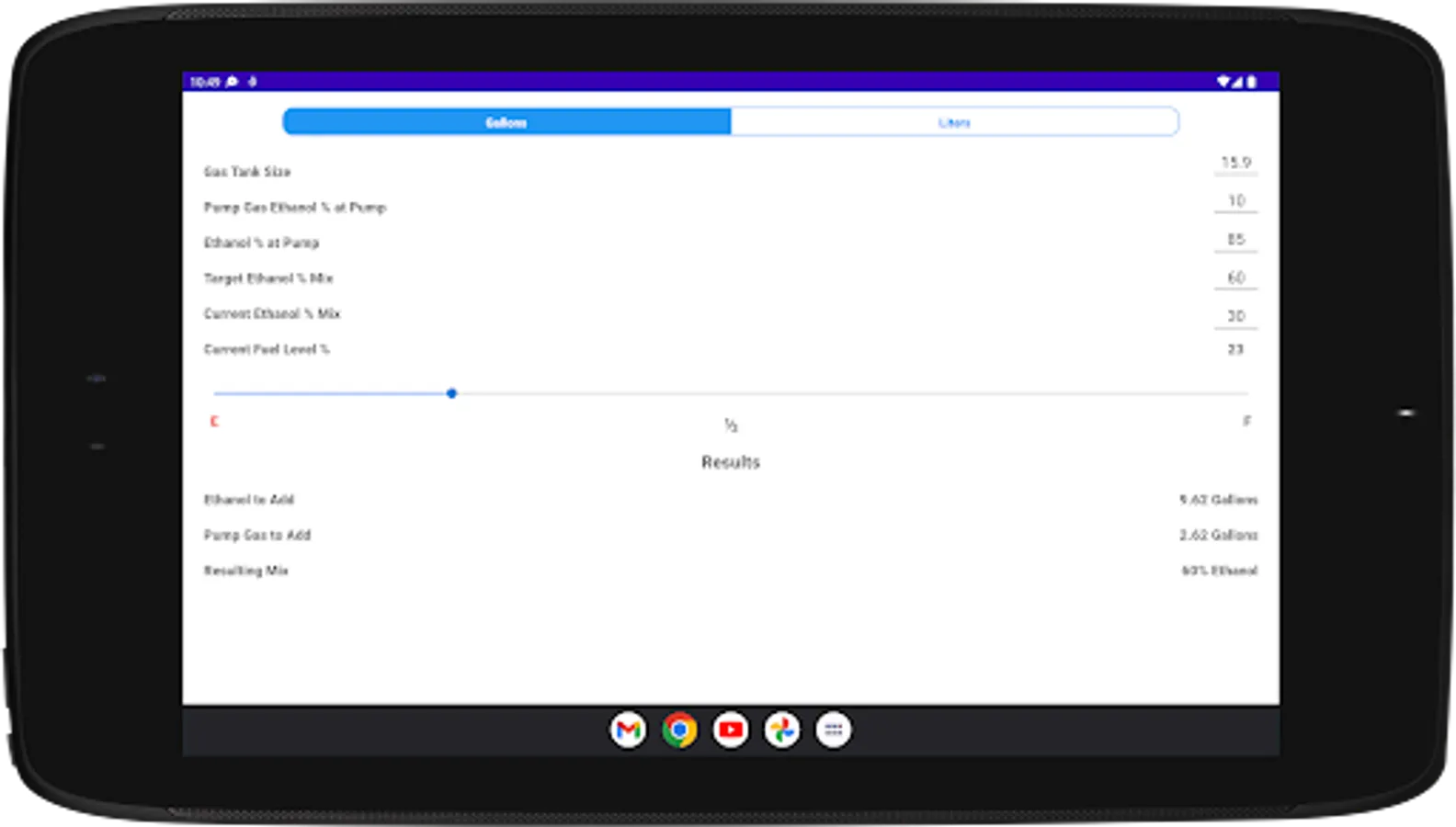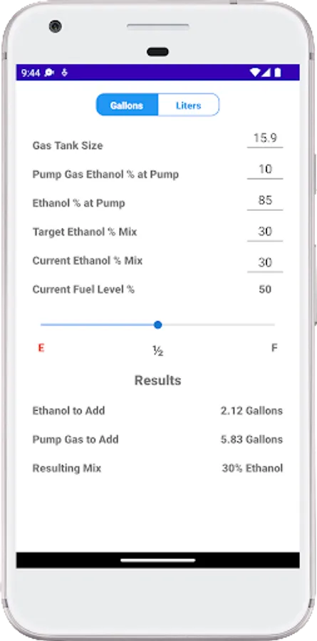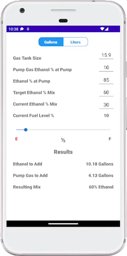 Results will display how many gallons or liters of standard and ethanol gas to pump in your vehicle based on your input.