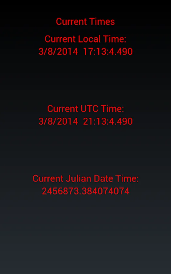 The current time screen shows three times: local time (as set by your phone), UTC time (synced to the Prime Meridian) and the Julian Date for the UTC time.