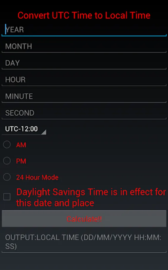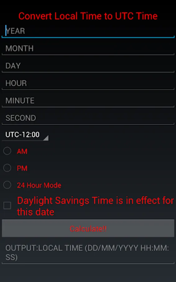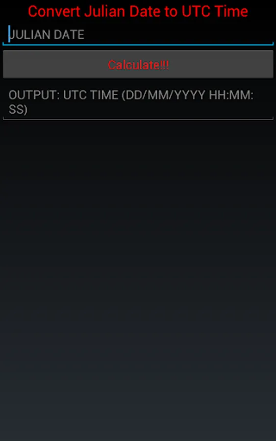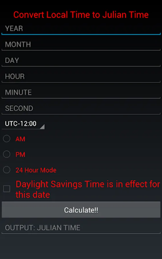 There are four separate screens for converting times from one to another: Local Time to Julian Date, Local Time to UTC Time, UTC Time to Local Time and Julian Date to UTC Time.