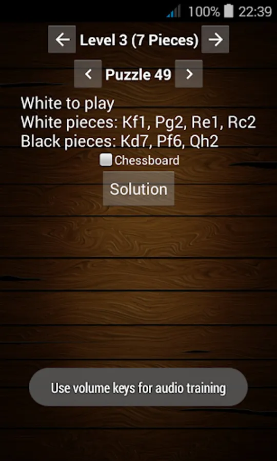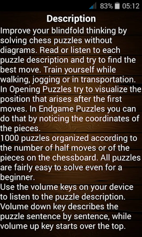 Improve your blindfold thinking by solving chess puzzles without diagrams. Read or listen to each puzzle description and try to find the best move. Train yourself while walking, jogging or in transportation.